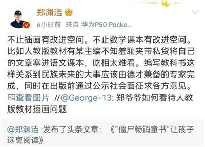 作家郑渊洁发帖称“人教版教材有某主编不知羞耻夹带私货”。