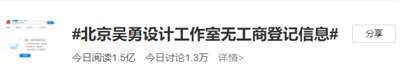 #北京吴勇设计工作室无工商登记信息#话题,不到一日,阅读也超过了1.5亿。