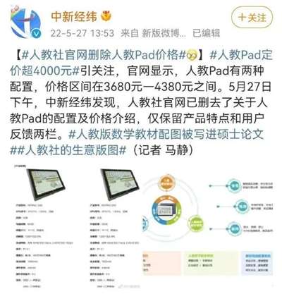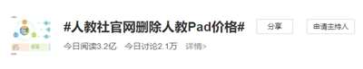 比如#人教社官网删除人教Pad价格#话题,不到一日的阅读就超3.2亿。