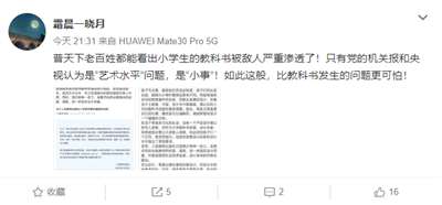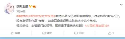 还有网民指出严重性:教材出品方还试图偷换概念,讨论作品“美”与“丑”。没有意识到作品“有毒”,故意回避意识形态阵地失守这个焦点。