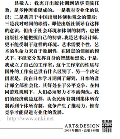 吕敬人曾在2005年一次采访中谈到离开出版社,成立自己工作室的原因,是苦于国内体制和观念的滞后,“即使出版社领导有这样的意识,但由于社会环境和体制的制约,也使出版社不能把握自己的初衷。我是艺术设计师,更不能受制于这样的环境。艺术需要个性,艺术的生命力来自于独创性,在固定的僵硬的模式下,不能充分发挥自身的智慧和想象。”