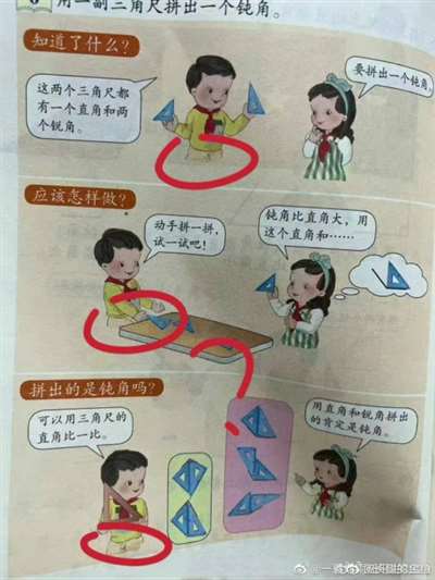 在网络上广为流传的图片中,引起巨大热议的其中一张,是讲钝角知识的。但由于这张图片裸露出来的部分内容“喧宾夺主”,应该无法让孩子们专心徜徉在知识的海洋。