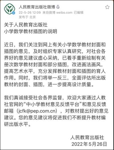 对此,人教社回应称,已着手重新绘制有关册次数学教材封面和部分插图,改进画法画风,提高艺术水平。