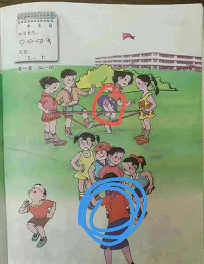 在这些插画中,男孩子的裆部都有很奇怪的凸起,而在这批教材的插图中,隐私部位暴露的不仅仅是男孩,女孩子们更是在画师的手下饱受摧残,不光被摸胸拽裙子,还被迫裙下走光......