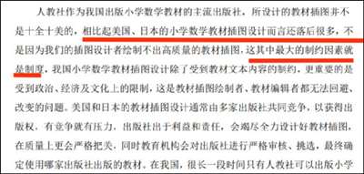 其中一部分内容指出,“人教社作为我国出版小学数学教材的主流出版社,比起美国、日本的小学数学教材插图设计而言还落后很多......最大的制约因素就是制度......受到了政治、经济及文化上的限制......”