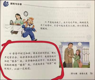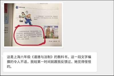 还有网友反映,上海六年级的《道德与法制》教科书,其中一段女儿与父亲的关于“圈养”和“饲养”的对话,让孩子感到非常不适。