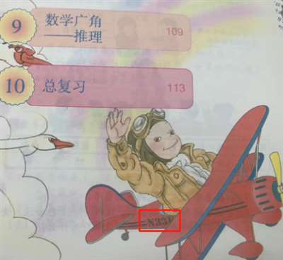 还有下面这张,是二年级上册目录页一个飞行员开飞机的形象中,飞机上清楚地写着N33K。飞机注册号首码以N开头的,一般是美国籍的飞机,敢问为什么中国的小学教材上,中国的飞行员为什么开着美国的飞机?我能想到的只有一种情况,那就是这个飞行员移民了。