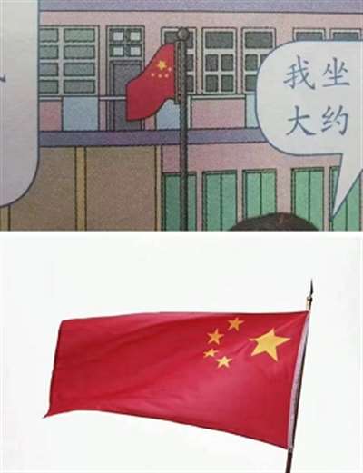 大家仔细看下图国旗中星星的位置,上面是教材中的国旗,下面是我国国旗真正的样子,位置差了十万八千里。