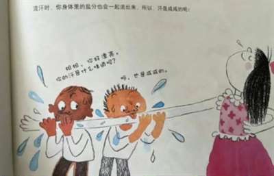 在人教版数学教材引起大范围热议之后,江苏凤凰少年儿童出版社出版的幼儿绘本《流汗啦!》的插画也迅速引发争议。