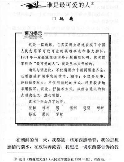 再联想到,《刘胡兰》、《黄继光》、《雷锋日记》、《谁是最可爱的人》、《狼牙山五壮士》以及鲁迅的《药》、《狂人日记》、《阿Q正传》等十多片作品被移除教材。其中,《谁是最可爱的人》一文作为报告文学的经典之作,所承载的不只是文学形象,更是历史事实。若非舆论倒逼,《谁是最可爱的人》一文将在新生代的记忆中消失。