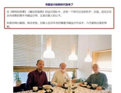 “资源平台”要画重点,吴勇这个人,其实已经不是一个人了,而是一个“资源平台”,这批“毒教材”是“吴勇工作室”设计的,吴勇毕业于清华美院装潢系书籍装帧专业,现为汕头大学长江艺术与设计学院视觉传达专业主任、教授、硕士生导师。这批毒教材的艺术设计总顾问,是吴勇的恩师,吕敬人;这批毒教材的封面设计中有一个名字,叫做吕旻,正是吕敬人的儿子。