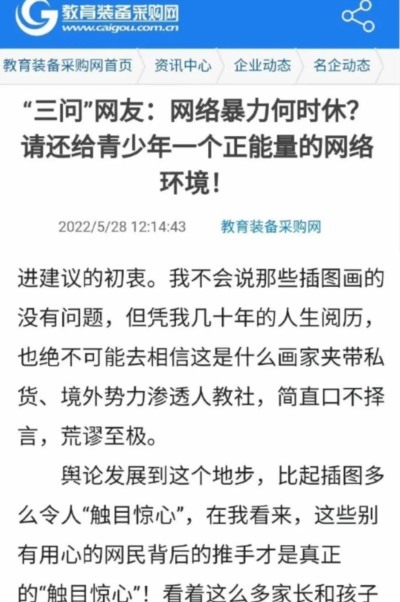 某“教育设备采购网”直接给人民群众扣帽子,怒斥“上纲上线”、“网络暴力“。