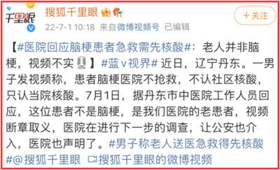 7月1日,有一男子发布视频称:脑梗患者送医,但医院不认社区核酸,只认当院核酸,所以不抢救。