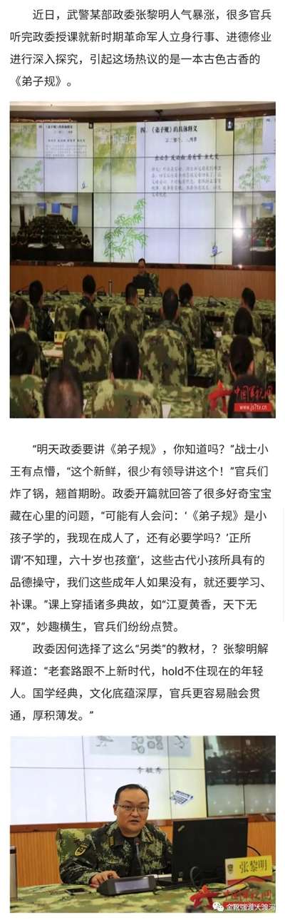 同在去年,还有一条让人错愕的新闻(经查是2018年时的旧闻):武警部队某部,在一位名叫张黎明的政委的带领下,集体学习儒家经典《弟子规》,且官宣语气十分自豪,如官文自介所言:老套路跟不上新时代,hold不住现在的年轻人。国学经典,文化底蕴深厚,官兵更容易融会贯通,厚积薄发。