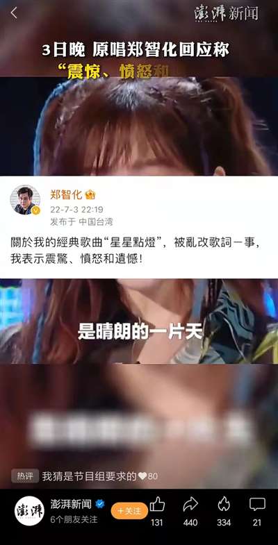 7月1日播出的《乘风破浪的姐姐第三季》节目中,由王心凌、阿娇、阿Sa、张天爱、吴谨言公演翻唱的《星星点灯》,被网友发现歌词被修改了。