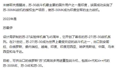 过去10年来,俄罗斯航空装备出口占到出口量的40-50%,今天甚至超过了这个数字。从2000年开始,俄罗斯国防出口公司向国外交付了约700架苏-27/苏-30战机。2021年,公司的订单组合又增加了出口苏-30SM战机的新合同。