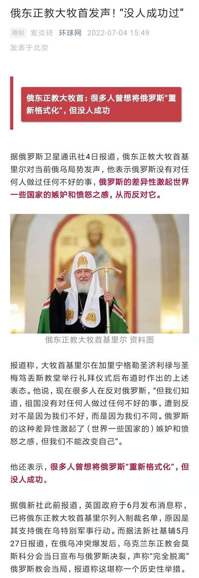 21、俄东正教大牧首:很多人曾想将俄罗斯“重新格式化”,但没人成功