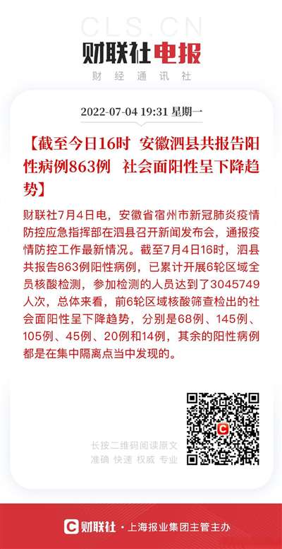 9、截至今日16时 安徽泗县共报告阳性病例863例 社会面阳性呈下降趋势
