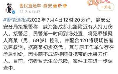 4日14时17分,上海市公安局静安分局发布通报称,4日12时20分许接报警称威海路成都北路附近有人持刀伤人,目前警方已将犯罪嫌疑人高某(男,59岁)控制,伤者暂无生命危险。通报称,据高某初步交代,其与原工作单位存在矛盾纠纷,因协商不成遂持随身携带的水果刀伤人。