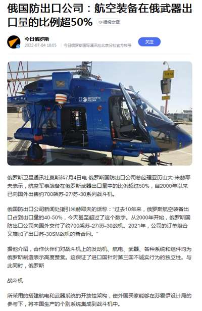 18、俄国防出口公司:航空装备在俄武器出口量的比例超50%