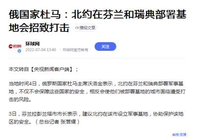 22、俄国家杜马:北约在芬兰和瑞典部署基地会招致打击