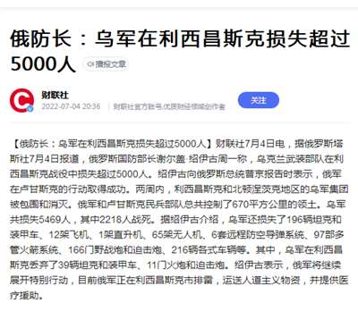 15、俄防长:乌军在利西昌斯克损失超过5000人