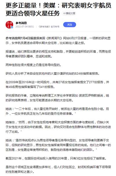 据美国《新闻周刊》网站6月27日报道,一项新的研究显示,女宇航员更适合领导长期太空任务,比如前往火星之旅。