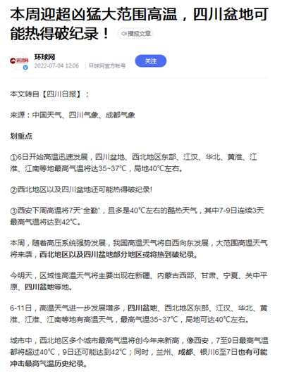 ③西安下周高温将7天“全勤”,且多是40℃左右的酷热天气,其中7-9日连续3天最高气温将达到42℃。