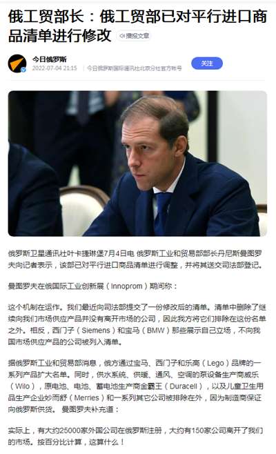 20、俄工贸部长:俄工贸部已对平行进口商品清单进行修改