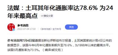 23、土耳其年化通胀率达78.6% 为24年来最高点