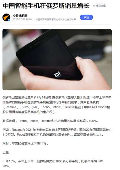 俄罗斯卫星通讯社莫斯科7月14日电 据俄罗斯《生意人报》报道,今年上半年中国品牌的智能手机在俄罗斯手机销量排行榜中名列前茅,其中包括真我(Realme)、Vivo、小米、Tecno、Infinix、iTel和诺基亚(中国HMD Global控股公司拥有诺基亚品牌手机的生产权)。