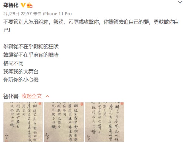 “颓废”的郑智化,其实并不颓废,这次导致他被禁言的发声已经不是第一次,“激扬文字,粪土当今万户侯”的郑智化常常为时局发声: