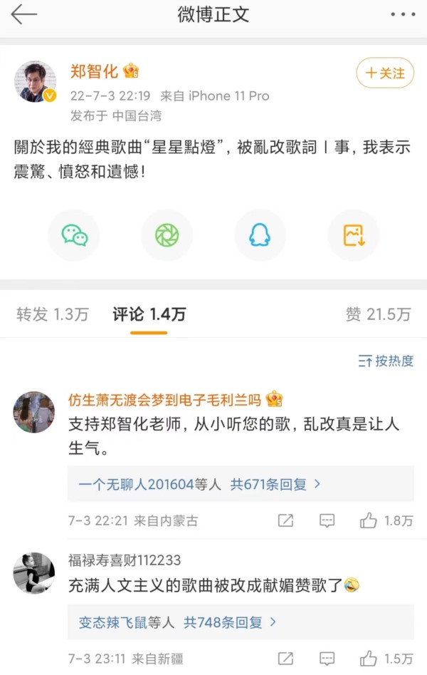 《星星点灯》是台湾歌手郑智化的成名曲之一,针对这样篡改,昨晚,郑智化通过新浪微博作出了回应: