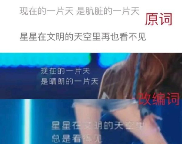 原歌词“肮脏的一片天”被改成了“晴朗的一片天”,“星星在文明的天空里再也看不见”被改成了“总是看得见”;有网友指出,此前在央视节目中,歌手演唱的竟然也是这个改编后的歌词。