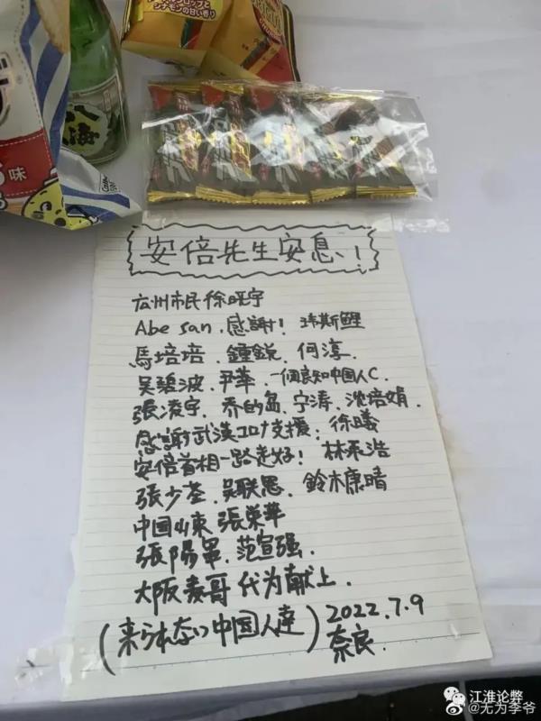 第四个孝子,王志安局长,毕业于武汉大学、北京大学,乃是央视、《新京报》《南方都市报》的记者。此人亲自到安倍被杀的现场致祭,显得要比胡锡进诚恳得多。