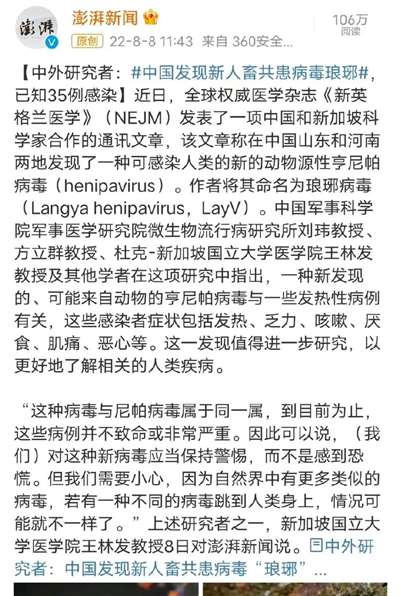 8月4日,《新英格兰医学杂志》(NEJM)发表了一项中国和新加坡科学家合作的通讯文章,报道在中国山东临沂和河南两省新发现的一种可感染人类的、动物源性亨尼帕病毒,并将其命名为Langya病毒(Langya henipavirus,LayV)。
