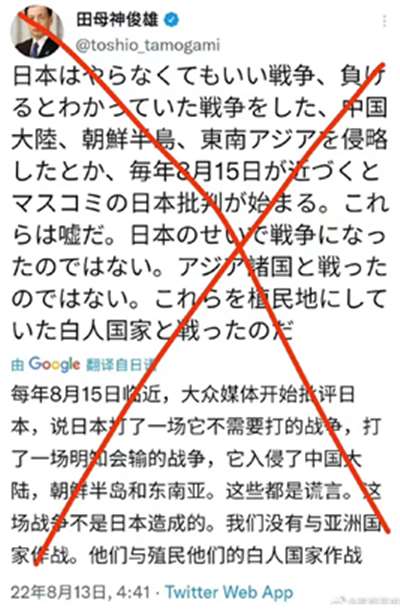 时至今日,日本的战争罪行都未被完全清算,日本也竭力淡化甚至否认战争罪行。8月13日,日本右翼分子田母神俊雄还公开为日本的侵略洗地,说日本入侵中国大陆、朝鲜半岛和东南亚都是“谎言”,“战争不是日本造成的,日本没有与亚洲国家作战,他们与殖民他们的白人国家作战”。看到没,别说不承认战争罪行了,连战争都不承认了。