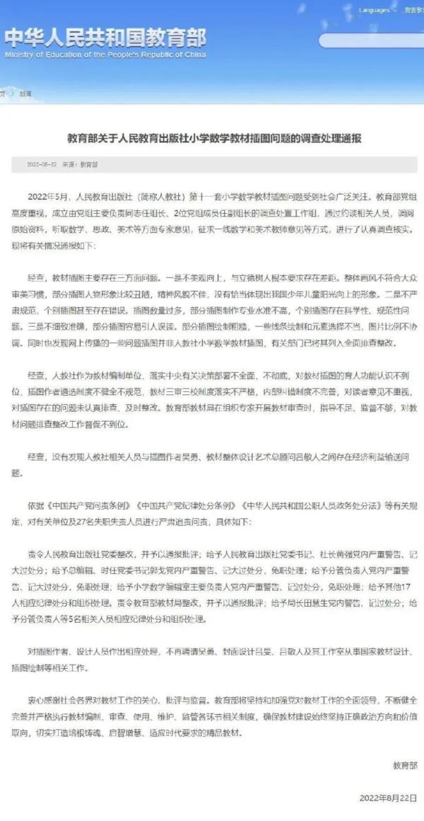 今天上午,教育部网站发布了“关于人民教育出版社小学数学教材插图问题的调查处理通报”:
