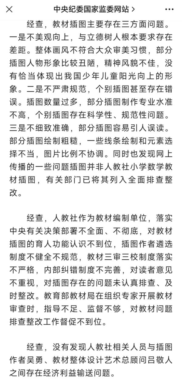 “通报”认为,教材插图存在“不美观向上”、“不严肃规范”、“不细致准确”等三个方面的问题,责任检讨主要针对的是“人教社”以及负责指导、监督的“教育部教材局”;调查“没有发现人教社相关人员与插图作者吴勇、教材整体设计艺术总顾问吕敬人之间存在经济利益输送问题”。
