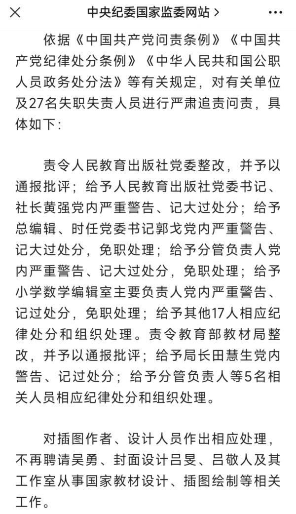 针对已经调查出来的问题,人教社党委、小学数学编辑室、教育部教材局等有关单位及27名失职失责人员被追责问责,相关单位被要求整改,相关人员分别给予了“记过”、“免职”等处分;针对设计毒教材插画的吴勇等人的处理,则是“不再聘请吴勇、封面设计吕旻、吕敬人及其工作室从事国家教材设计、插图绘制等相关工作”。