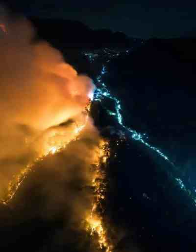其中有两张照片,更是直击国人的灵魂深处,让很多人看到后热泪盈眶。第一张照片是抗灾过程的重庆北碚缙云山发生在晚上的一幕,左边是肆虐的红色火光,右边是灭火人员手中的灯光连成的星河,在照片的视角下形成了一个大写的“人”。第二张照片是重庆志愿者们集体背着物资从山脚下一直蜿蜒到山顶的队伍。
