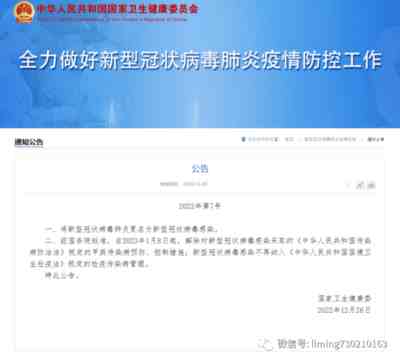 2022年12月26日,国家卫健委发布2022年第7号公告:将新型冠状病毒肺炎更名为新型冠状病毒感染。与此同时,国务院联防联控机制发布对新型冠状病毒感染实施“乙类乙管”总体方案。