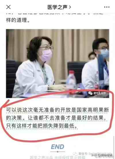 既然没人买单,闹剧就会持续上演,扯淡就会更加泛滥。例如,医学之声公众号就发布了这样一个观点,他们认为“这次毫无准备的开放是国家高明果断的决策。让谁都不去准备才是最好的结果,只有这样才能把损失降到最低。”