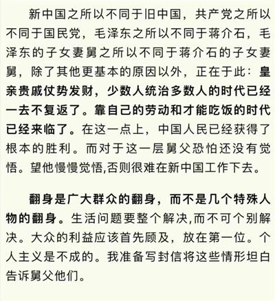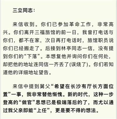前文提到岸英,不妨就以岸英在建国后给表舅向三立的一篇回信做例——就我个人而言,真心呼吁岸英同志的这篇回信收录进校园的教科书,以及各级党校的必备教材: