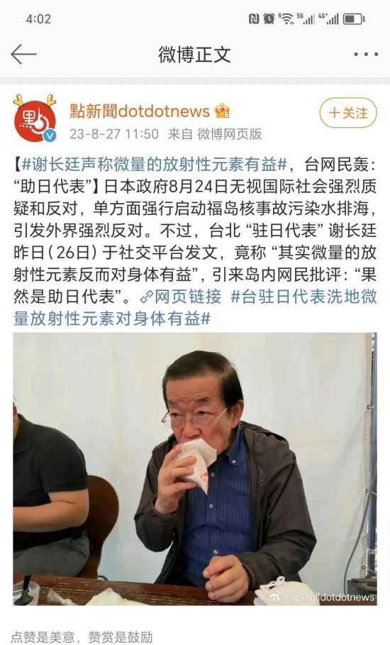 台湾的日本孝子,关键时刻自然要为太君分忧,一句“微量的放射性元素反而对身体有益”,把太君洗得比白天鹅还白。