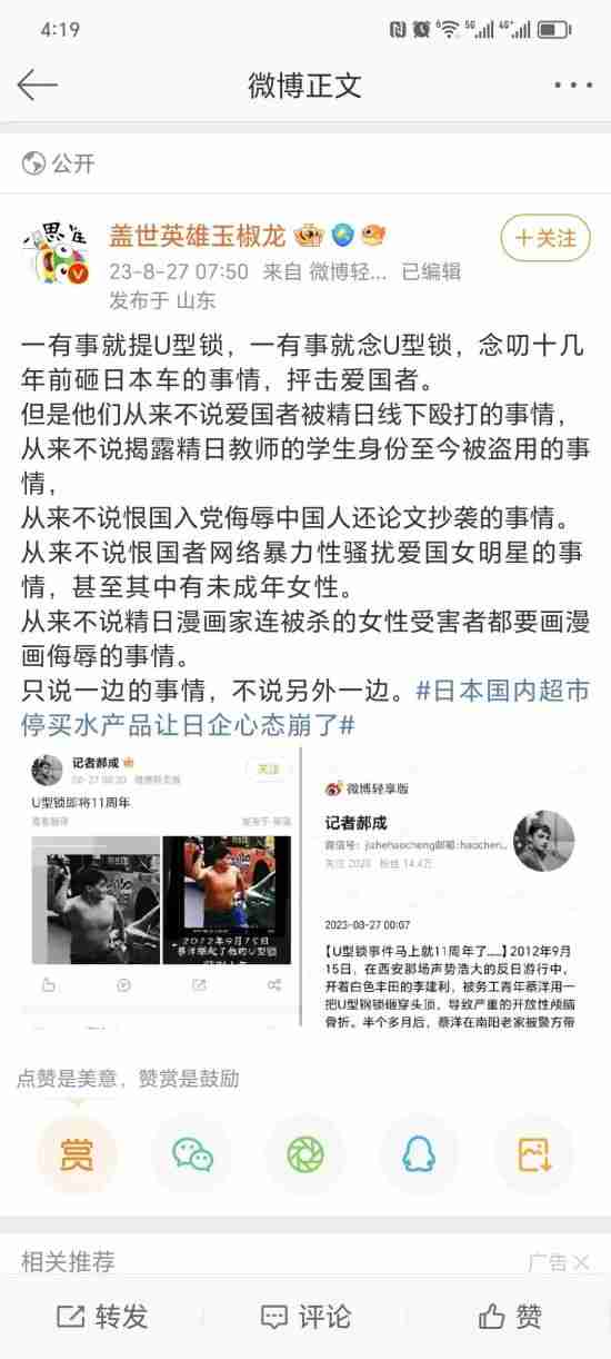这个记者在中国网民控诉日本排放核污水的这几天,连续两篇提起十几年前的U型锁事件,这种做法的目的,看看他另一篇微博,用意不言自明。