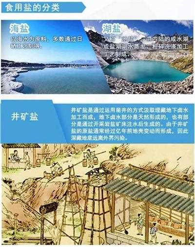 以食盐的来源来区分,可以分为井盐、湖盐、海盐三类,井盐是利用凿井法汲取地表浅部或地下天然卤水进行加工后获得,最有名的就是四川自贡井盐;对咸水湖中的盐分进行蒸发结晶而获得的是湖盐;利用海水蒸发结晶产生的则是海盐。