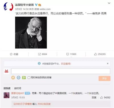 那一次论战的高潮部分是法国大使馆搬出雨果的话来说事,马上被中国网民用雨果的另一句话怼了回去。无奈,法国大使馆用鲁迅的话“墨写的谎言,决掩不住血写的历史”堵中国人的口,又被中国网民以迅雷不及掩耳之势打回去,因为这句话是1926年3月法国等八个国家援引《辛丑条约》要求段祺瑞政府撤出大沽口防务并给以最后通牒,鲁迅对随后发生的“三.一八”惨案有感而发。