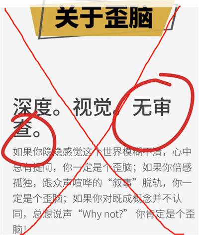 《歪脑》是“自由YZ电台”开发出来的新产品,以“青春”、“新潮”、“叛逆”为幌子,主攻年轻人方向,鼓吹“女权”,“LGBT”,“环保”,“网络游戏”,“艺术创作”,“科技动态”,“素食主义”,“反传统”……无论他们的题材怎么千变万化,最终的结论都是“体制压制年轻人的精神诉求”,鼓动年轻人“冲破传统”、“拥抱文明”、“做世界公民”——和90年代煽动苏联和东欧年轻人向往西方一模一样。