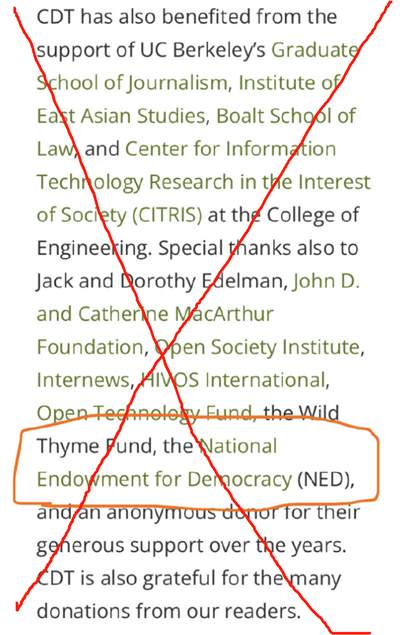 CDT的主要投资方是NED。NED,即“national endowment for democracy”,是由美国国会直接拨款建立的。它的创建目的是“通过在其他国家扶持政治、经济机构来推动其他国家的民主”——又一个彻头彻尾的颜革机构。
